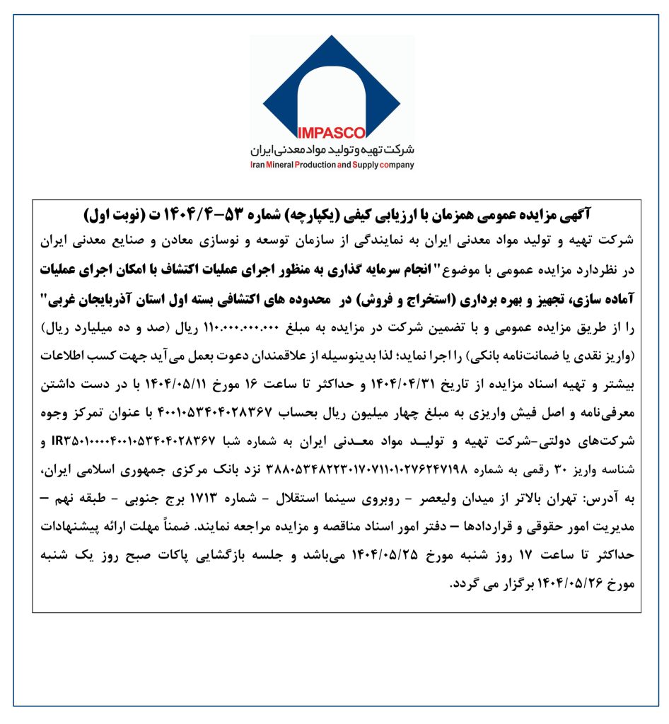 ایمپاسکو به نمایندگی از سازمان توسعه و نوسازی معادن و صنایع معدنی ایران در نظردارد مزایده عمومی با موضوع” انجام سرمایه‌گذاری به منظور اجرای عملیات اکتشاف با امکان اجرای عملیات آماده سازی، تجهیز و بهره برداری (استخراج و فروش) در محدوده‌های اکتشافی بسته اول استان آذربایجان غربی” را برگزار کند.