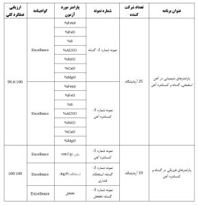 نتایج به دست آمده از این آزمون ها کمترین انحراف ممکن روی آنالیزهای گزارش شده توسط آزمایشگاه را نشان داد که این واحد موفق به اخذ 5 گواهینامه Excellence (عالی ترین سطح گواهینامه) گردید. همچنین در ارزیابی کلی عملکرد، این واحد در برنامه اندازه گیری پارامترهای فیزیکی در گندله و کنسانتره آهن با 19 آزمایشگاه شرکت کننده نمره 100 از 100 و در برنامه پارامترهای شیمیایی در گندله و کنسانتره آهن با 25 شرکت کننده نمره 98.6 از 100 را به دست آورده است. این موفقیت مرهون تلاش اصولی، سیستماتیک و علمی همکاران در بخش آزمایشگاه بوده و تکرار آن در سال های اخیر نشان از بلوغ در فرایندهای کاری این واحد دارد.