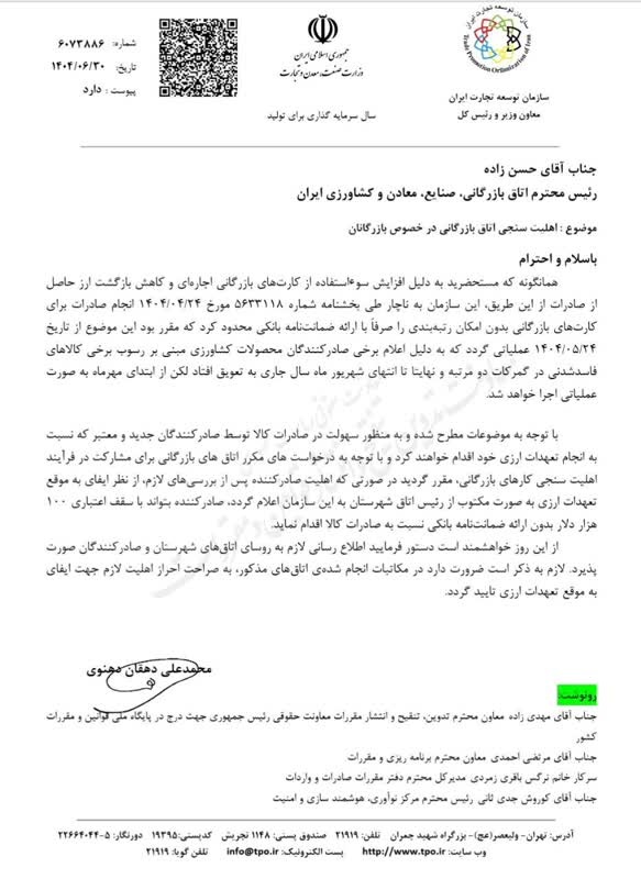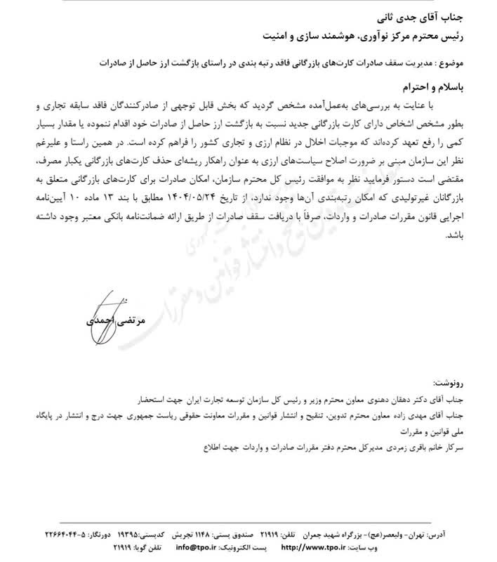 سازمان توسعه تجارت ایران اعلام کرد: اجرای بخشنامه شماره ۵۶۳۳۱۱۸ مورخ ۲۴ تیر ۱۴۰۴، با هدف مقابله با سوءاستفاده از کارتهای بازرگانی اجارهای و ارتقاء بازگشت ارز حاصل از صادرات، از ابتدای مهرماه ۱۴۰۴ عملیاتی خواهد شد.